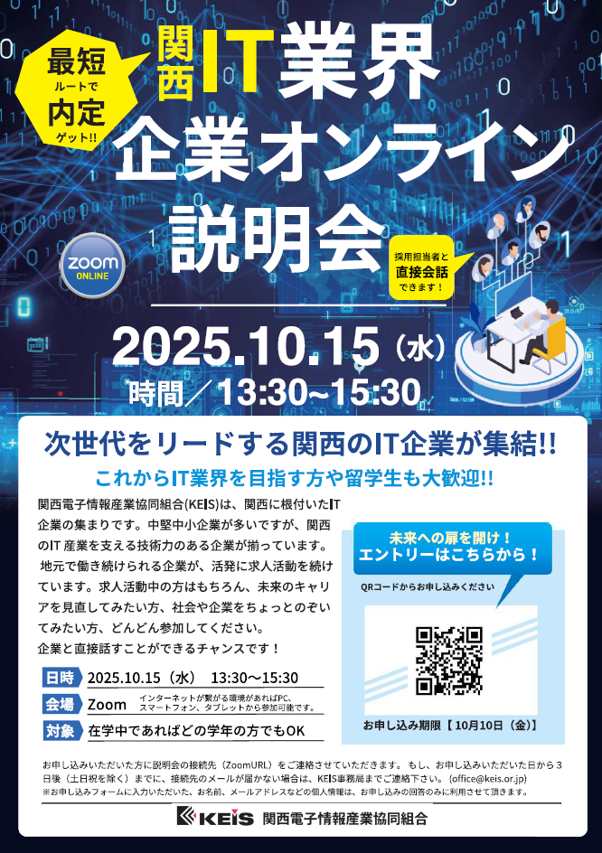 関西のIT企業9社合同の説明会です。Zoomで開催されます。興味のある方は、是非、ご参加ください。